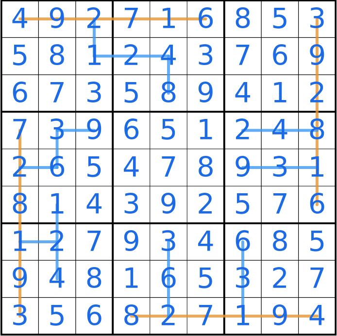 Yellow lines are Modular Lines, cells with the same value remainder 3 must not be fewer than 3 cells apart. (So 1-5-6-4 is fine, but 2-6-8 isn't.)