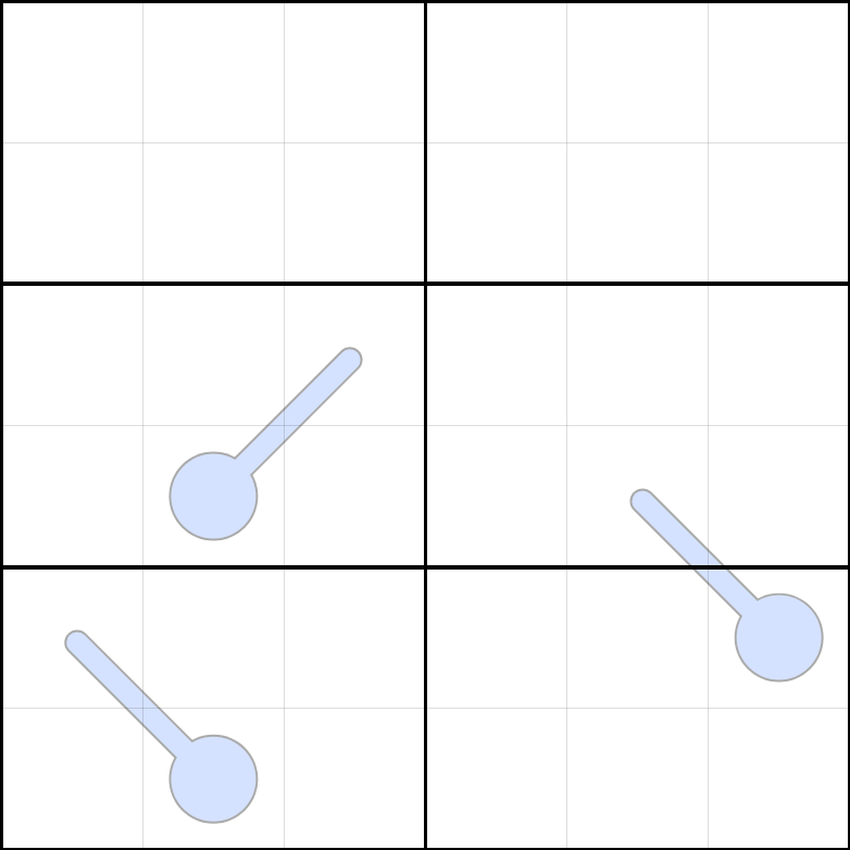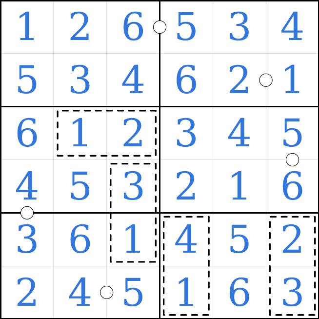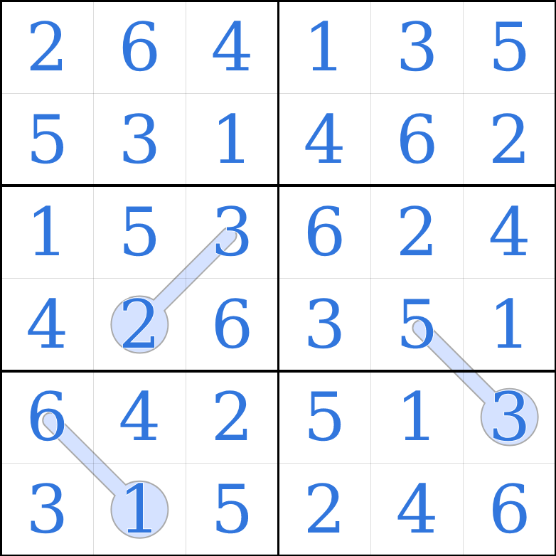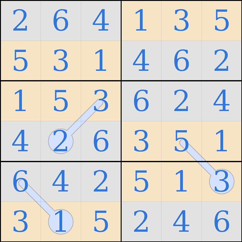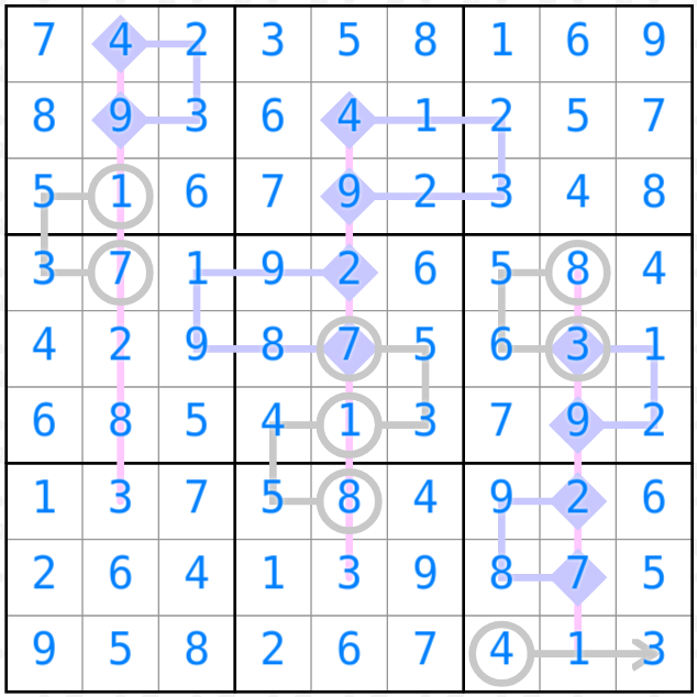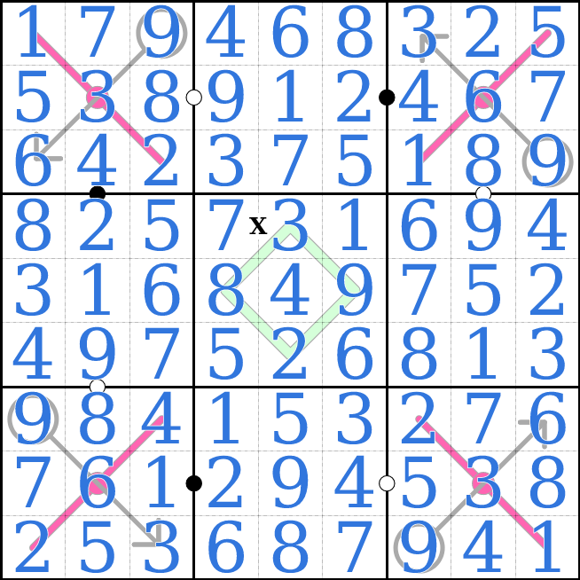 Normal sudoku rules apply. Circles indicate there is a cell of the same value along a diagonal at a distance equal to that value.