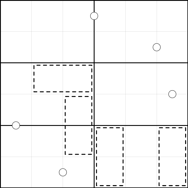 The two sets of circles are not counting circles - they have conspired with each other such that if one of the sets contains N Ns, the other set may contain 2*N Ns.White kropke dots connect two cells that differ by one. The quads are communal white kropkes: if N is found in one of the cells, then N-1 or N+1 will be found in one of the other cells.