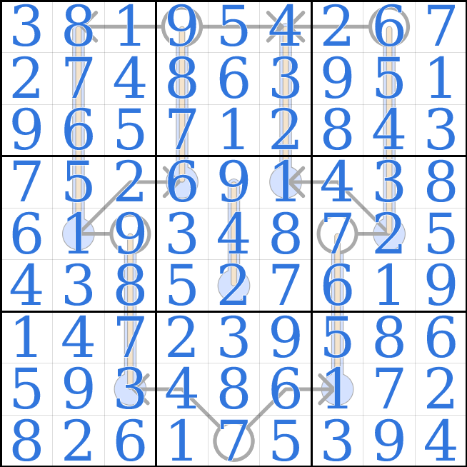 The blue line is an entropic line, each sequential group of three cells must have one value from {1,2,3}, one from {4,5,6} and one from {7,8,9}.