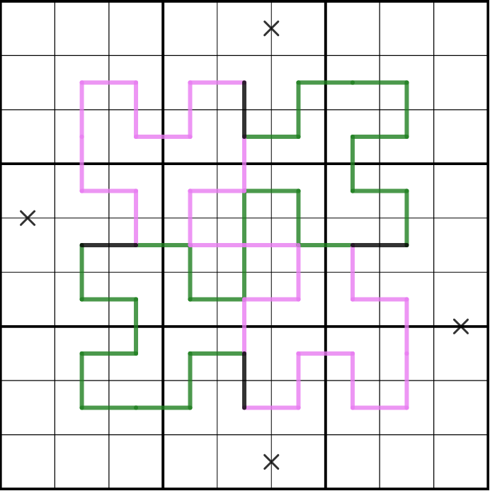 Black Xs connect cells that sum to 10, purple Xs connect cells that sum to 5.