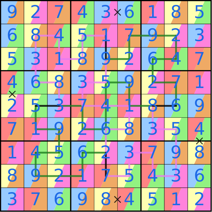 Dark green lines are Entropy Lines, cells in the same low (123), mid (456), and high (789) bands must not be fewer than 3 cells apart. (So 2-8-4-3 is fine, but 4-3-1 isn't.)