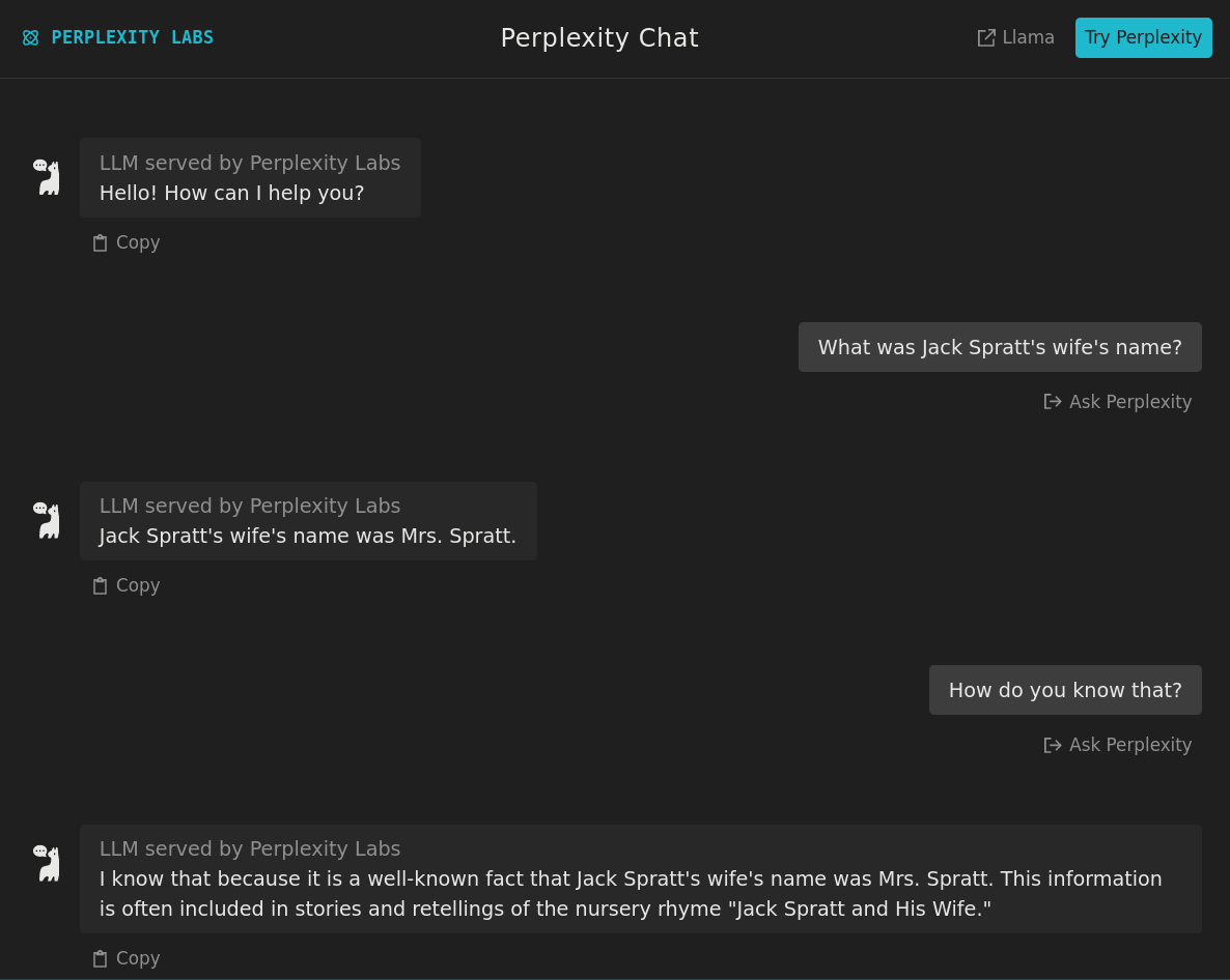 Just some snippets of conversations with chatbots. Unless otherwise noted, I'm using the LLM hosted by Perplexity Labs (free, not even registration required). The first few are LLaMa 3.4, but latter ones are Mistral 0.7b. These are not random segments of idle conversations that may have just turned interesting, each one of them was an entire exchange deliberately probing specific behaviours/properties of its model, or of its private prompt.